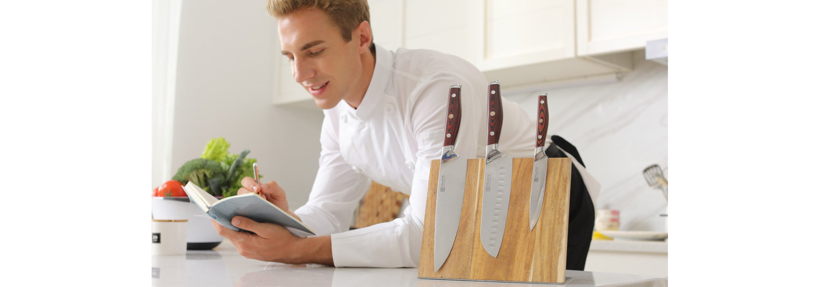 A Magnetic Knife Bar is a great option for small kitchens that lack tons of counter space. They also serve as an attractive way to display your knives and you can easily see the knives to choose the right one for the task. They attach to the wall and firmly hold knives in place.